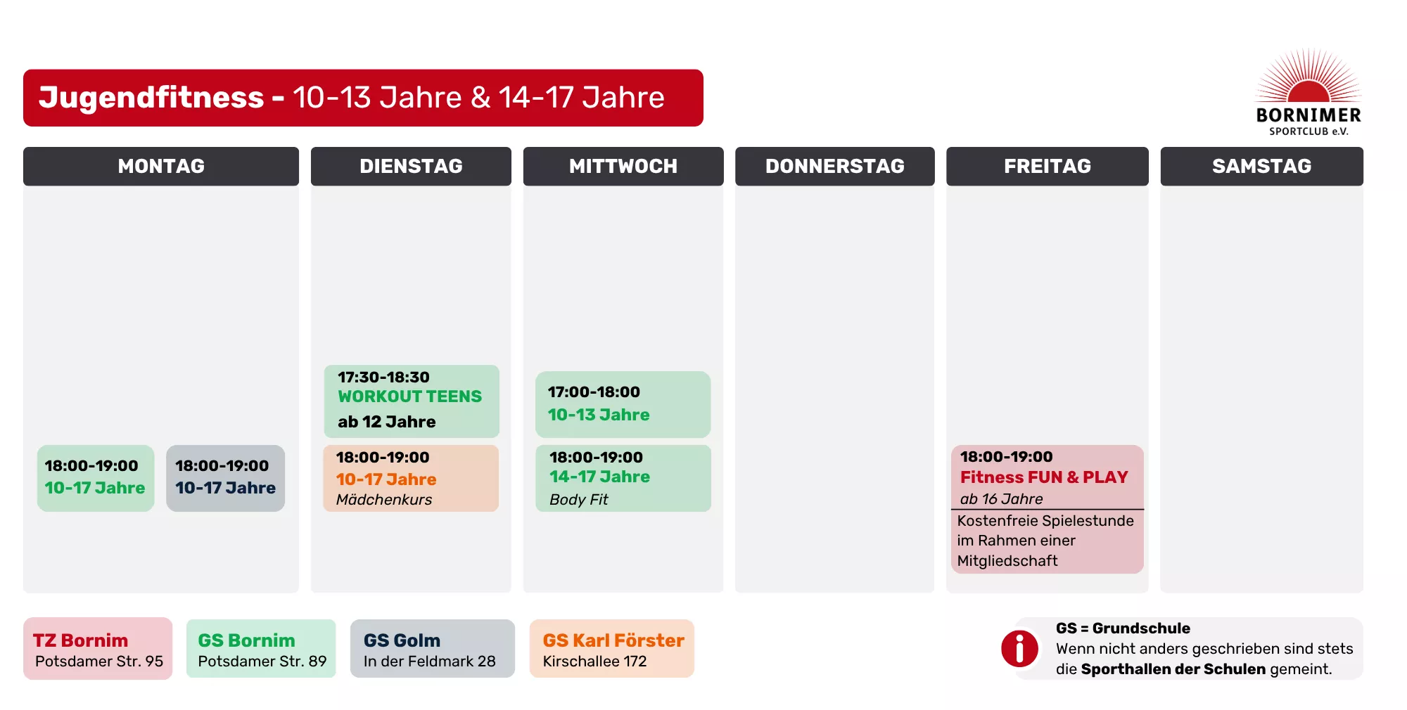 Jugendliche sollen Spaß an der Bewegung spüren und das mit ihrer Altersklasse. In der Jugendfitness gemeinsame Challenge meistern und die Schulnoten verbessern durch eine bessere Fitness im Alltag!